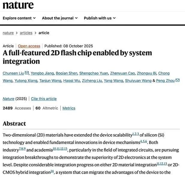 10月8日,复旦大学集成电路与微纳电子创新学院周鹏、刘春森团队在《自然》(Nature)期刊上发表题为《全功能二维-硅基混合架构》(A full-featured 2D flash chip enabled by system integration)论文,率先研发出全球首颗二维-硅基混合架构。