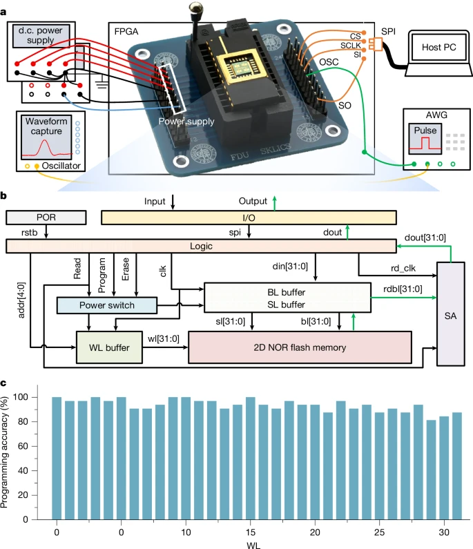 正是这项核心工艺的创新,实现了在原子尺度上让二维材料和CMOS衬底的紧密贴合,性能“碾压”目前的Flash闪存技术。测试结果显示,该新型存储芯片集成良率达94.3%,支持8-bit指令操作、32-bit高速并行操作与随机寻址。