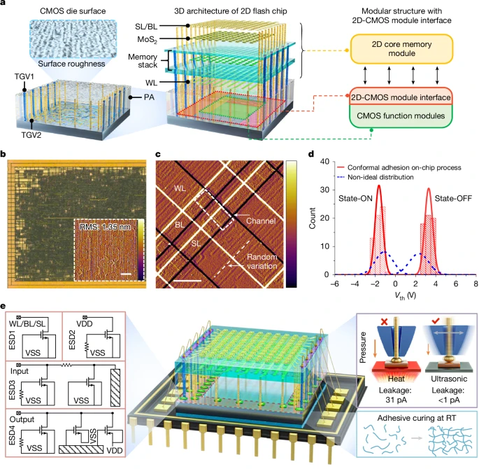 如何将二维材料与CMOS集成又不破坏其性能,是团队需要攻克的核心难题。“我们没有必要去改变CMOS,而是要去适应它。”团队从本身就具有一定柔性的二维材料入手,通过模块化的集成方案,先将二维存储电路与成熟CMOS电路分离制造,再与CMOS控制电路通过高密度单片互连技术(微米尺度通孔)实现完整芯片集成。